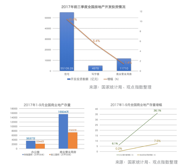 从国家统计局公布的数据来看,商业地产的投资热情更为高涨。2017年前三季度全国房地产开发投资80644亿元,同比名义增长8.1%,增速比1-8月份提高0.2个百分点。其中住宅增速增长10.4%,增速提高0.3个百分点;办公楼投资4978亿元,同比增长5.4%;商业营业用房11710亿元,总比增长1.4%。