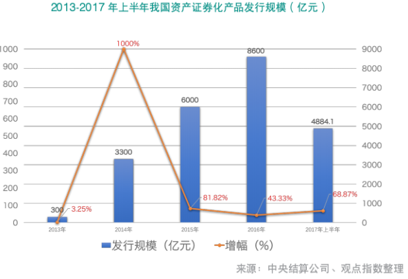 根据中央结算公司的数据统计,2013-2016年,我国资产化发行额逐年递增,由2013年300亿元上涨至2016年的8600亿元,增长近28倍。截至2017年上半年,全国共发行资产化产品4884.1亿元,同比增长68.87%,市场存量为14624.78亿元,同比增长66.48%。